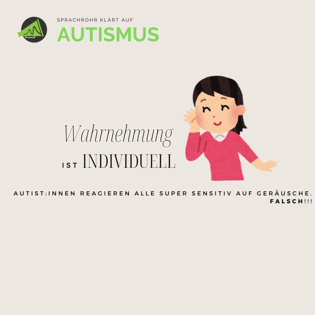 Ist mir da ein Fehler unterlaufen und ich habe vergessen Kind 1 abzuändern in Kind 2,3,4? NEIN. Es gibt nicht nur eine Wahrnehmung die immer zutrifft für eine:n Autist:in. Es kann sein, dass es grundsätzlich meist eine Hypersensitivität oder eine Hyposensitivität in der Hörverarbeitung gibt. Hypersensitivität: Geräusche werden größtenteils als unangenehm oder schmerzhaft wahrgenommen. Hyposensitivität: Geräusche können nicht laut genug sein. Und dennoch kann die Hyper- und Hyposensitivität auch tagesformabhängig sein oder sich im Verlauf des Tages ändern…